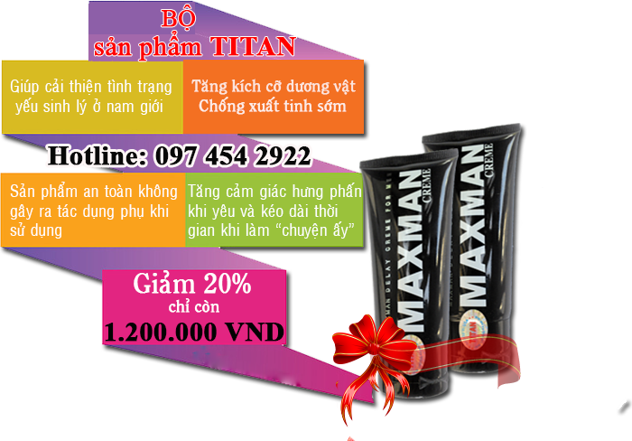 Để sức mạnh của cậu nhỏ được duy trùy cho những cuộc yêu đối với những chàng có vấn đề về cậu nhỏ như: Xuất tinh sớm, kích cỡ cậu nhỏ khiêm tốn, rối loạn cương dương thì hãy dùng đến sản phẩm hỗ trợ các vấn đề sinh lý nam giới Gel Titan Maxman.